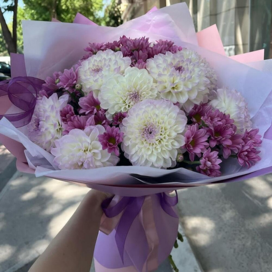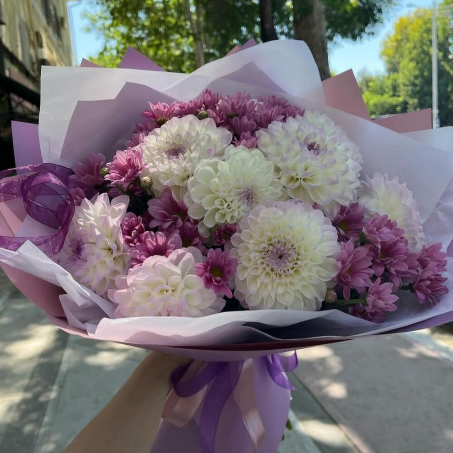 На фото букет из георгин и хризантем. В составе: георгина 9 шт, хризантема кустовая 5 шт, дизайнерская упаковка 2 шт, атласная лента 1 шт, . Все цветы свежие и ароматные, букет красиво оформлен и отлично подходит для подарка. Доступна доставка цветов или самовывоз.