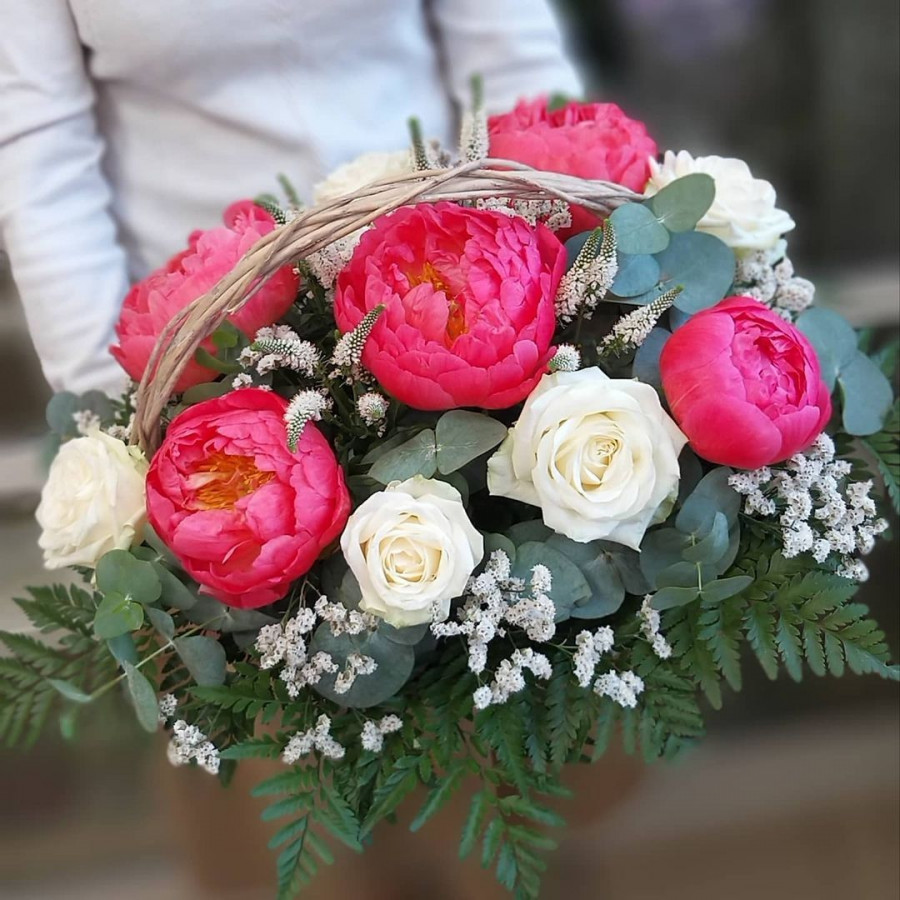 На фото коралловые пионы в корзине. В составе: пион 5 шт, роза 5 шт, статица 7 шт, папоротник 3 шт, эвкалипт 3 шт, корзина (m) 1 шт, . Все цветы свежие и ароматные, букет красиво оформлен и отлично подходит для подарка. Доступна доставка цветов или самовывоз.
